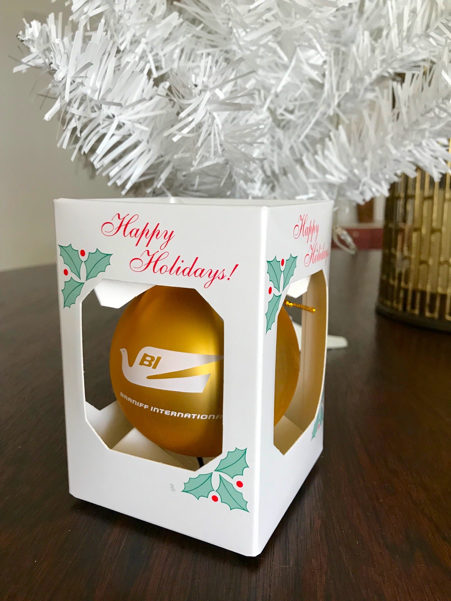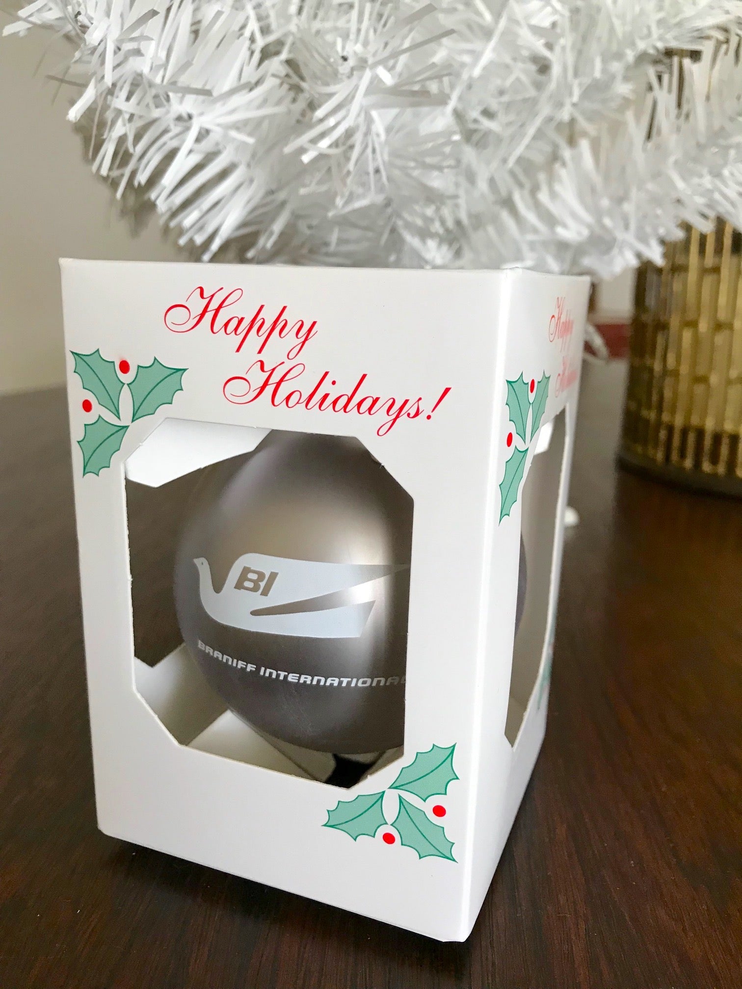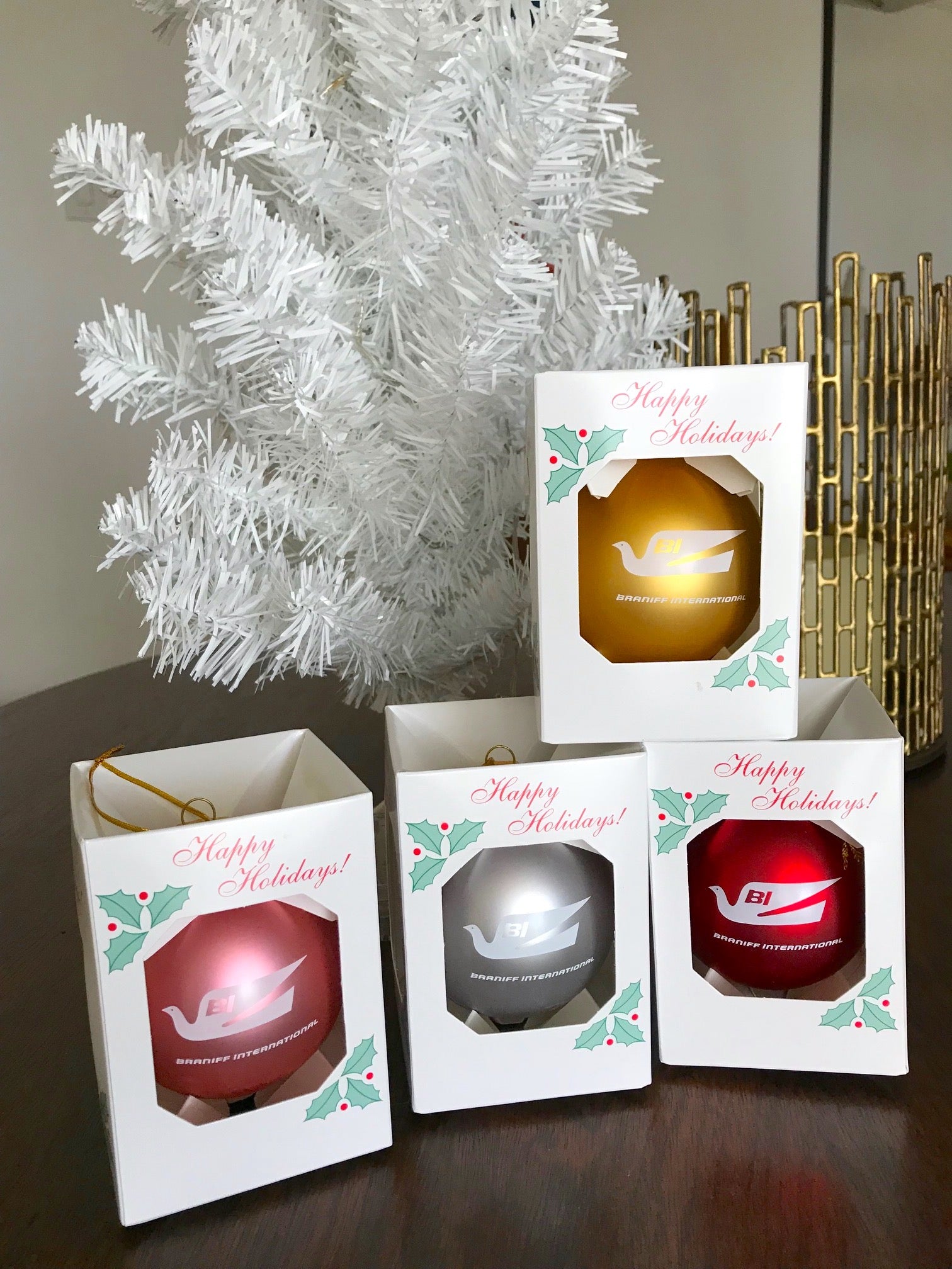 Celebrating Christmas with Braniff International is the only way to fly! In 1965, Braniff International revolutionized the airline industry when it introduced the End of the Plain Plane Campaign, which called for brightly colored aircraft exteriors and interiors and Haute Couture customer service employee uniforms from Emilio Pucci. This Christmas revolutionize your Christmas tree with this assortment of brightly colored glass End of the Plain Plane Christmas Ornaments with the 1965 Bluebird of Happiness logo imprinted in holiday white.
